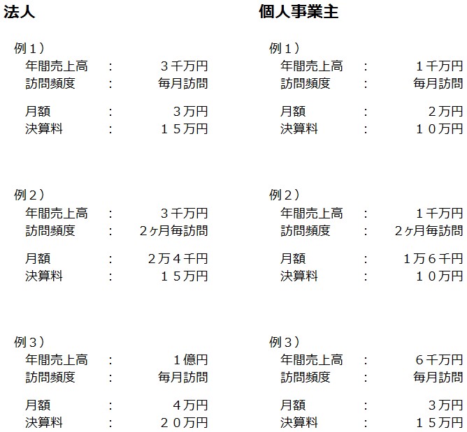 料金は、会社規模(売上高)・訪問頻度(毎月訪問or年6回等)等によって決まります。