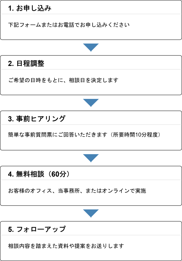 - オンライン相談:Zoom、Teams、Google Meetなど(ご希望のツールに対応します)