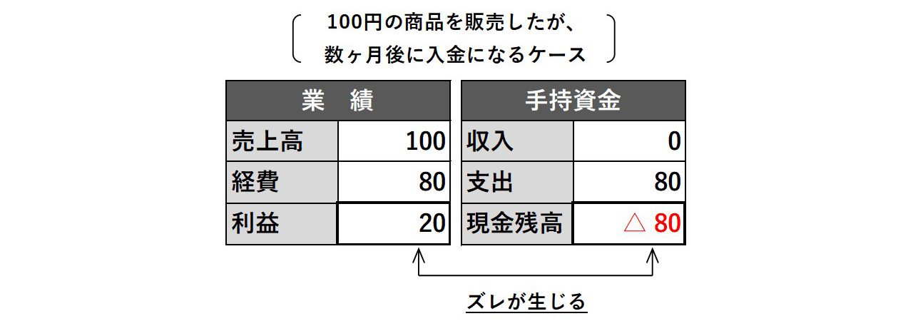 [aside type=”normal”]商品の販売時点で「売上高」となるが、入金が伴っていないため「現金の残高」とはズレが生じる[/aside]