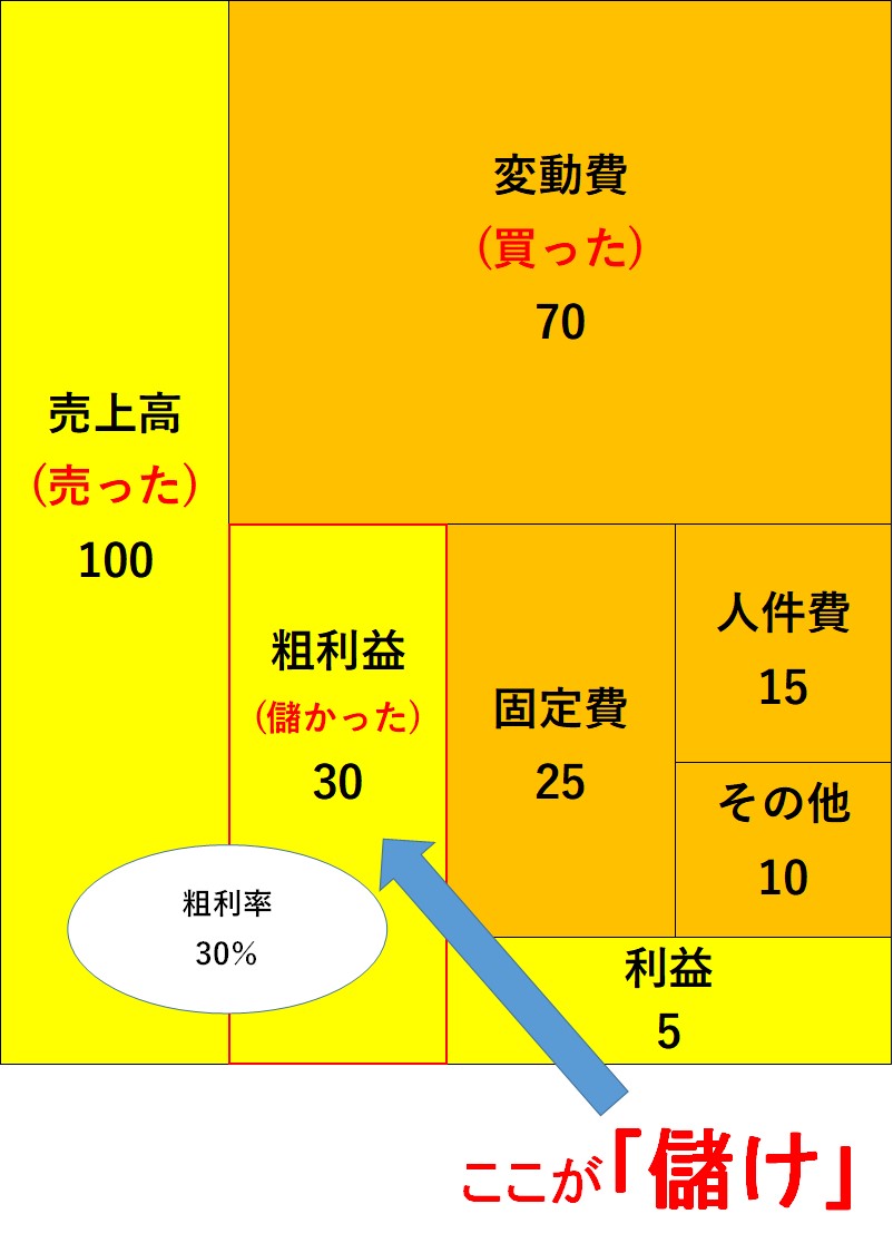 売って(売上高)、買って(変動費)、儲かった(粗利益)